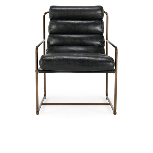 Argo, a sleek accent chair combines modern design with industrial charm. Upholstered in rich black leather with a ribbed back and seat, it offers b...
