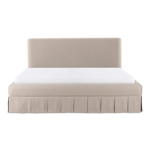 The Maren queen bed exudes a soft, feminine aesthetic, upholstered in a warm, neutral fabric and featuring a playful yet refined box pleat base rem...