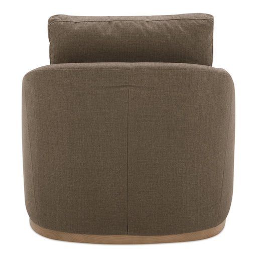 The Linden swivel chair features a curved barrel back paired with a generously sized toss cushion support. A smooth, solid wood base completes the ...